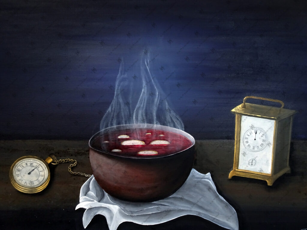 Uhrsuppe, Öl auf Leinwand, 2023 (50 x 70 cm).